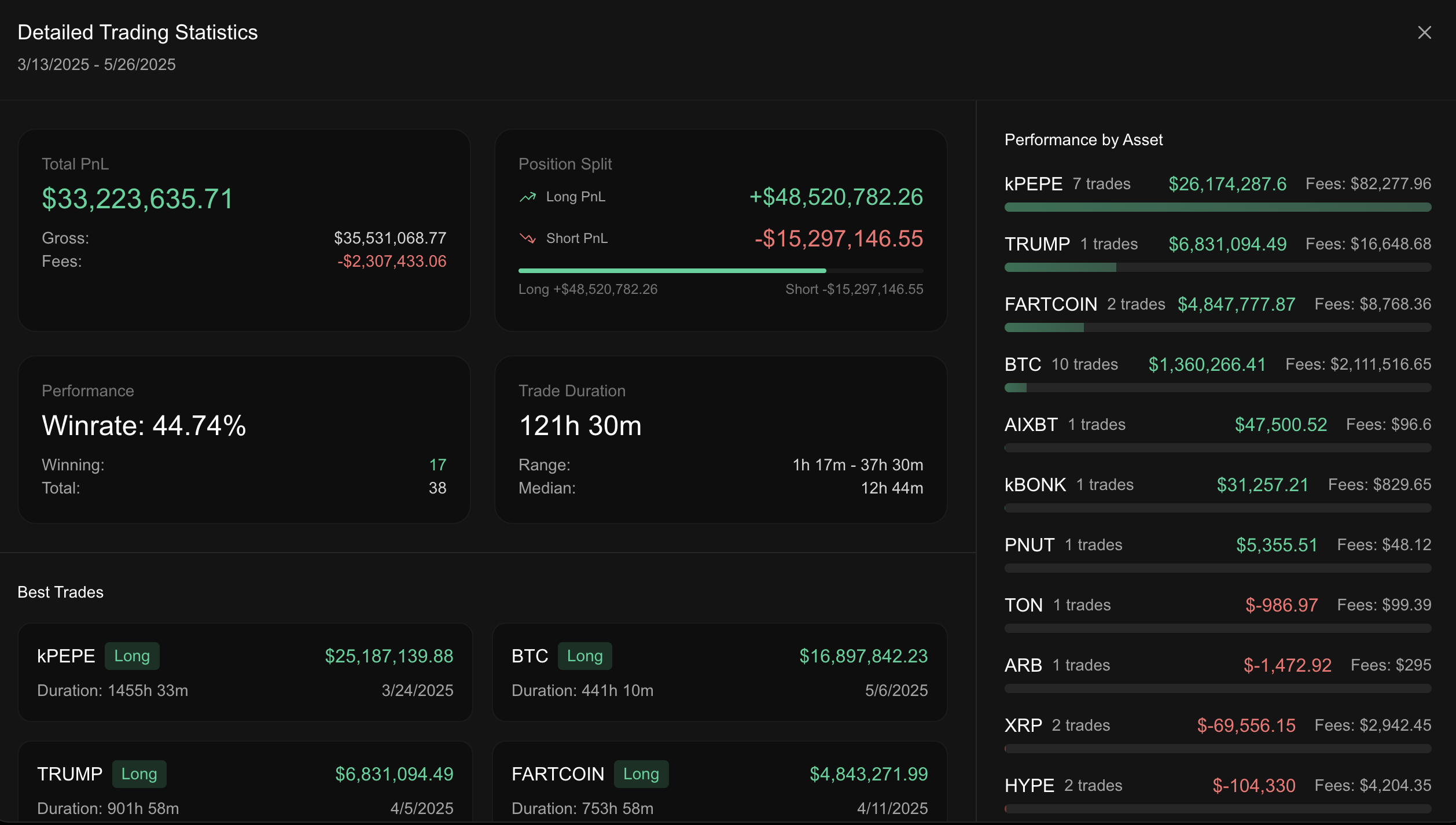 За даними CoinMarketCap, Hyperliquid зафіксував 24-годинний обсяг торгів у розмірі 8,6 млрд доларів, з яких 86,83 % припадає на торги перпсами. Платформа також отримує вигоду від комісій за транзакції, причому, за оцінками, Винн вніс близько 2,31 млн доларів у вигляді комісій за 75 днів, згідно з Lookonchain.