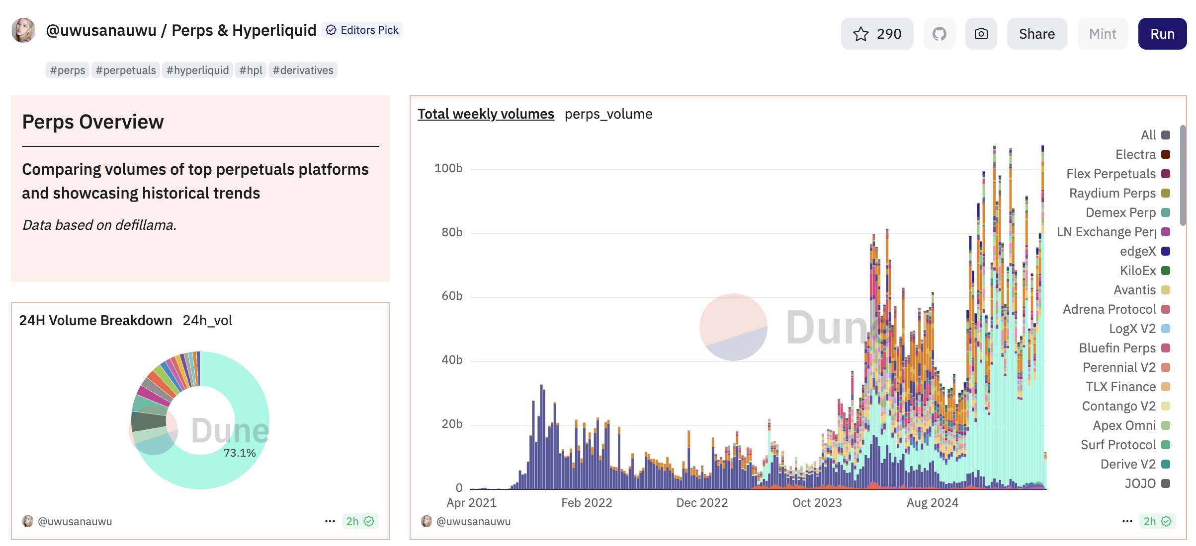 Дані з Dune Analytics показують, що Hyperliquid займає 73,1 % ринку торгівлі перпетами, з загальним обсягом торгів у 12,09 млрд доларів, до якого Вінн значно долучився.