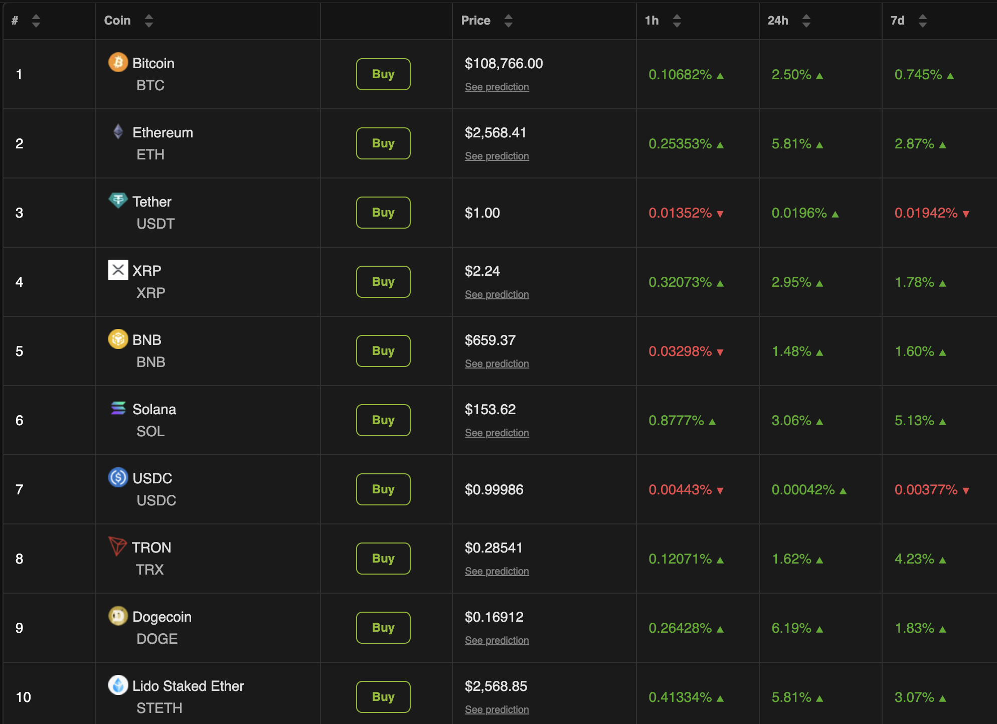 Відповідно до останніх даних від BeInCrypto, ринок став зеленим після ралі, викликаного зниженням тарифів на в’єтнамський експорт. Біткоїн зріс на 2,5 %, досягнувши 108 766 доларів на момент публікації. Ethereum показав ще більший стрибок, піднявшись на 5,8 % до 2 568 доларів.