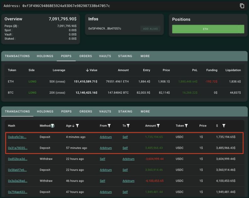 Платформа для аналітики блокчейну Spotonchain повідомила про серію значних угод з кредитним плечем, виконаних на платформі Hyperliquid. Згідно з їхнім аналізом, добре фінансований трейдер вніс 5,22 мільйона доларів на платформу, щоб відкрити високо кредитовані довгі позиції у біткоїн та ETH.