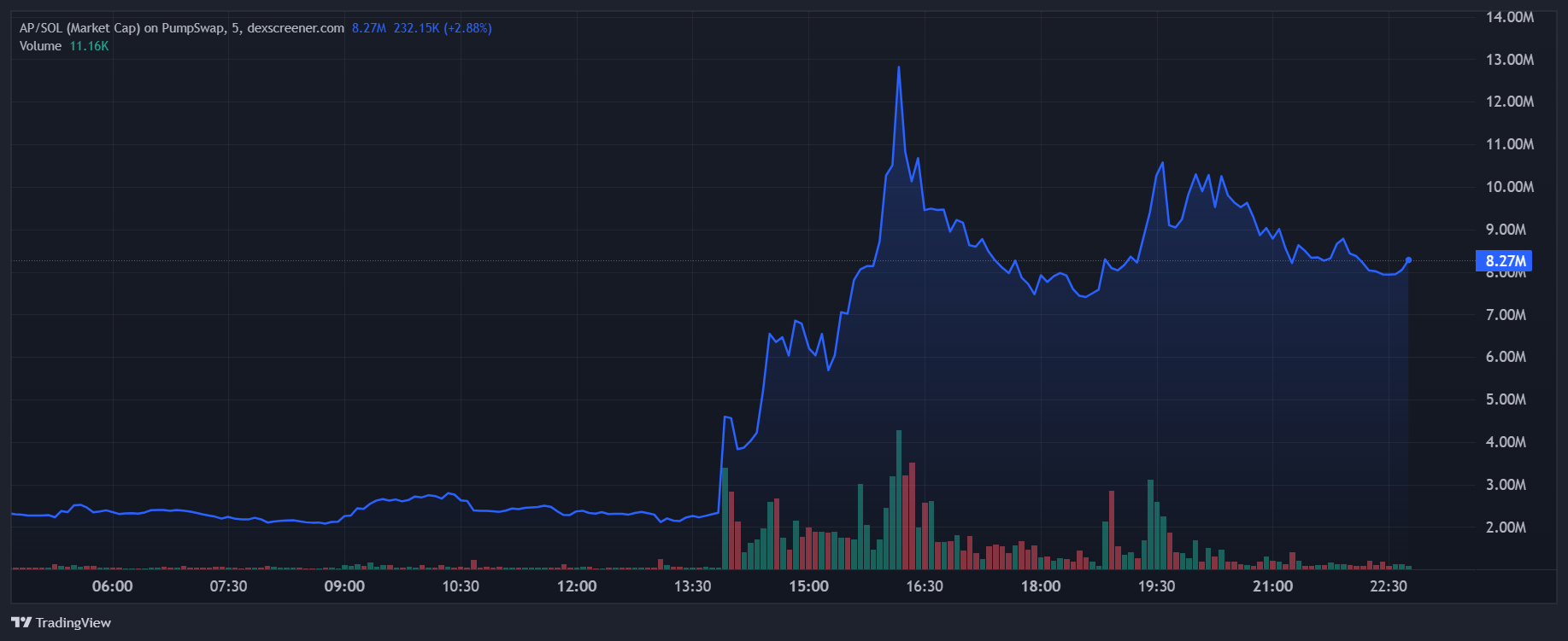 SponsoredКоли технічний директор обговорював плани розробки нової інституції, AP (America Party) зріс на понад 150%. Він досяг капіталізації в 10 млн доларів і наразі є найпопулярнішим токеном на DexScreener.
