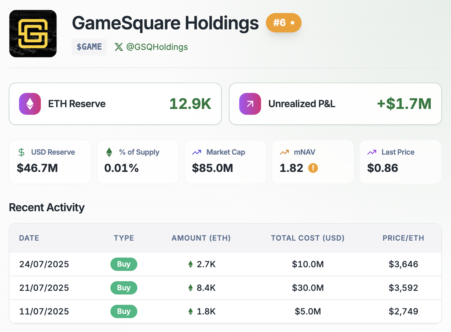 Дані з Strategic ETH Reserve показали, що GameSquare придбала близько 12 900 ETH між 11 і 24 липня, ставши шостим за величиною публічним власником.