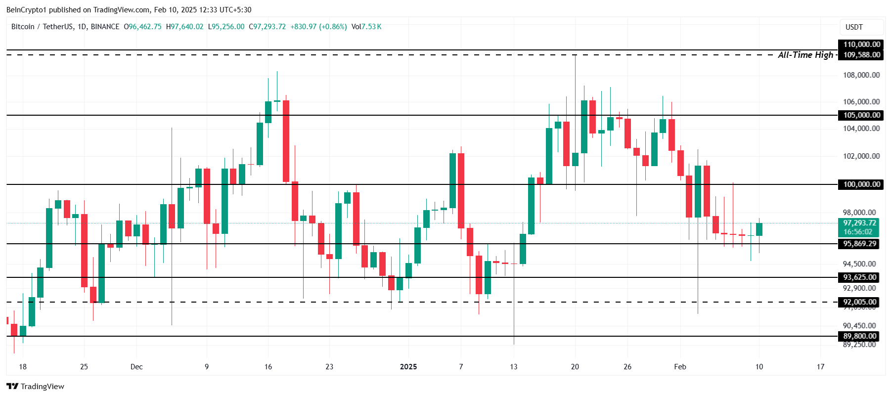Поточна ціна біткоїна у 97 293 доларів відображає його здатність утримувати підтримку вище 95 869 доларів. Цей рівень тримається протягом останнього тижня, забезпечуючи основу для потенційного відновлення. Поки біткоїн залишається вище цієї підтримки, можливий рух до опору у 100 000 доларів у найближчій перспективі.