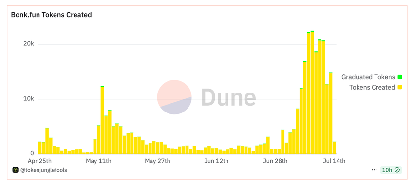 Кількість токенів, створених щодня на Bonk.fun з моменту запуску. Джерело: Dune Analytics