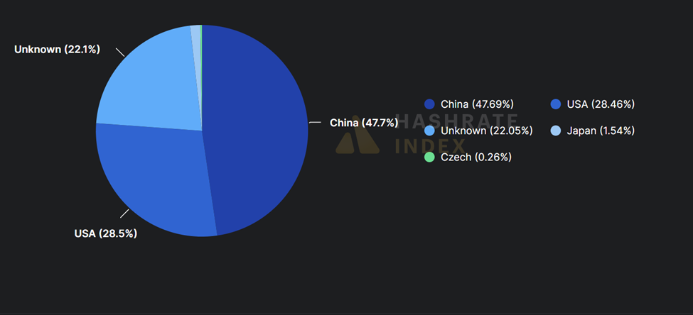 Тим часом США становлять 30 %, а Китай — 47 %. Кайзер також застеріг, що майнінговий центр Америки в Техасі може стати «стратегічною вразливістю», якщо ворожнеча загостриться в кіберпросторі або на землі.
