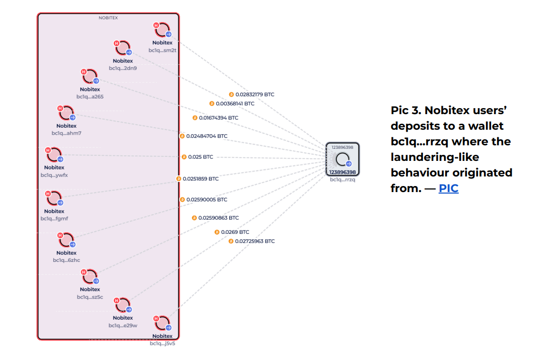Дані з блокчейну показують, що Nobitex використовувала метод, відомий як peelchaining. Це коли великі обсяги біткоїна розбиваються на менші частини і проходять через короткочасні гаманці.