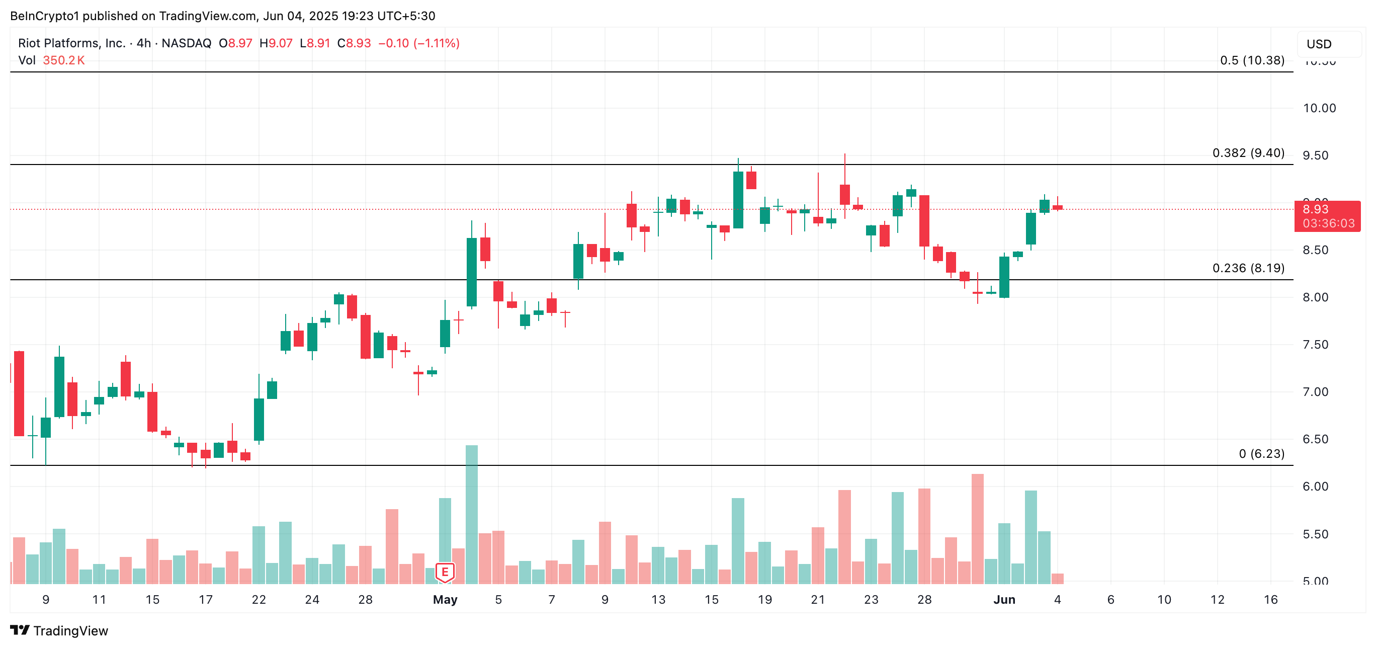 RIOT відкрив сесію в середу на рівні 8,93 доларів, що на 6 % більше за день, з підвищенням обсягу торгів, що свідчить про сильний інтерес інвесторів, який підтримує зростання ціни.