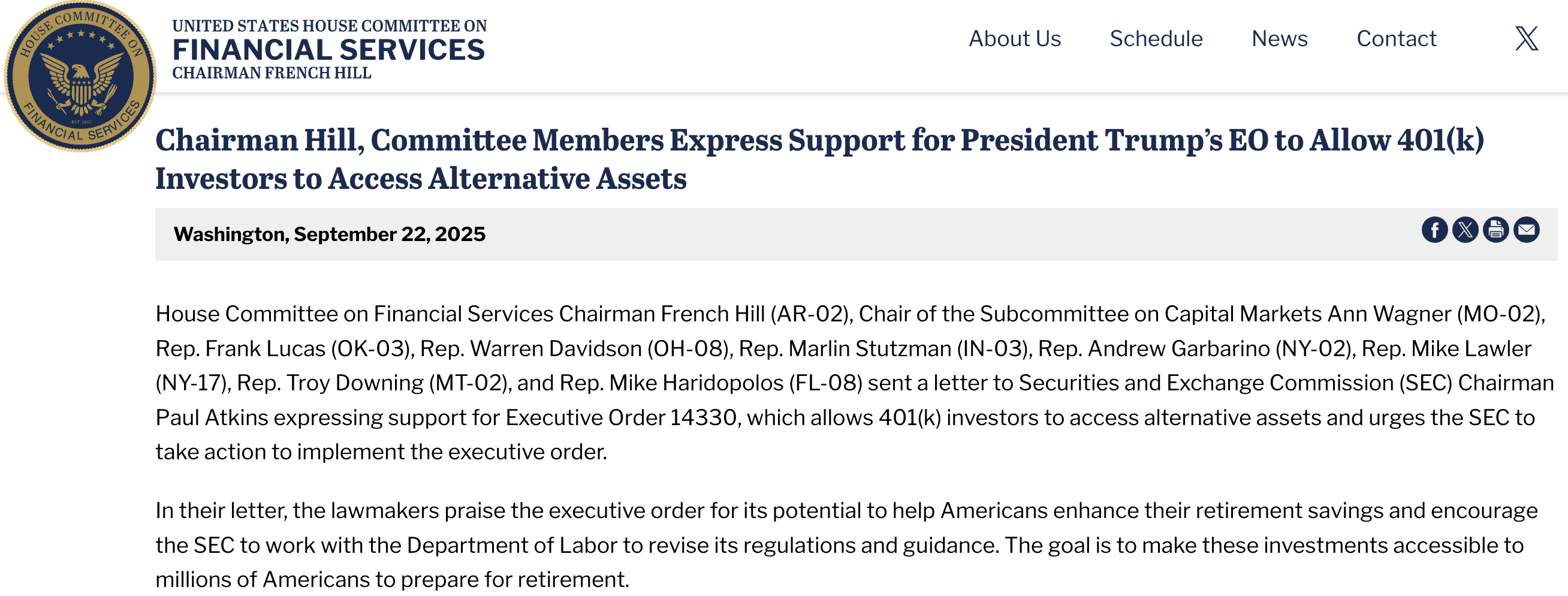 Коаліція, очолювана головою комітету Френч Хілл і головою підкомітету з ринків капіталу Енн Вагнер, підкреслила потенціал наказу відкрити альтернативні активи, які раніше були обмежені для заможних інвесторів.