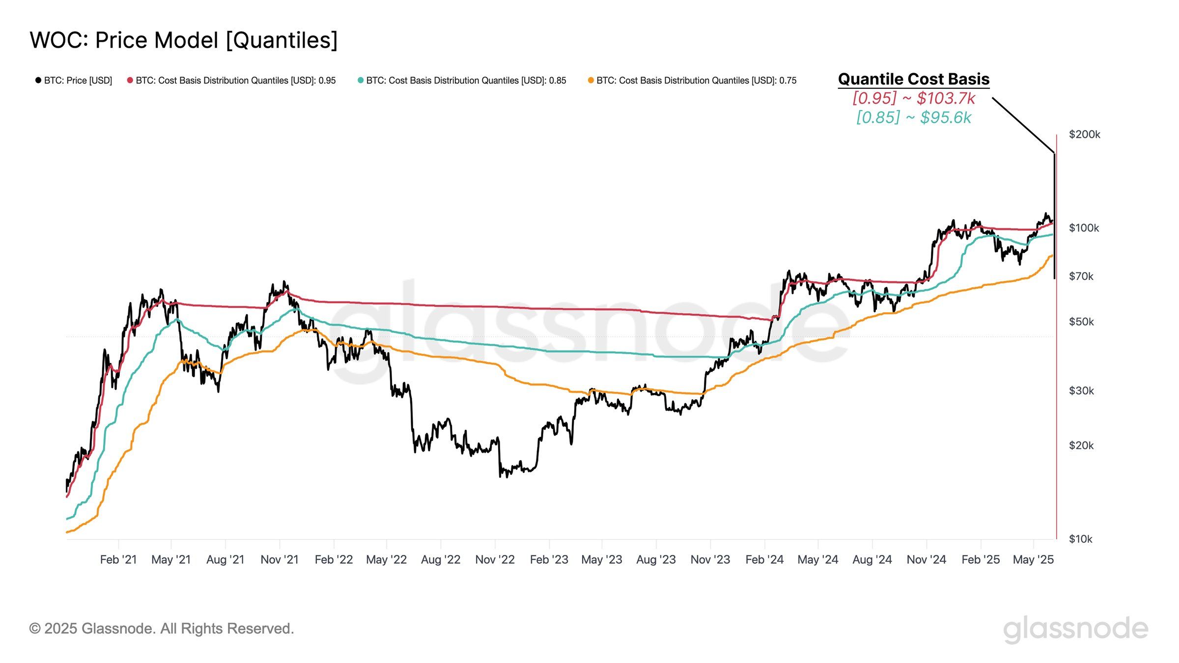 Квантилі вартості біткоїна підкреслюють ключові рівні підтримки, які можуть бути вирішальними у найближчій перспективі. 0,95 SSD (Розподіл Витратної Пропозиції) вказує на те, що 95 % циркулюючої пропозиції біткоїна було придбано за ціною нижче 103 700 доларів.