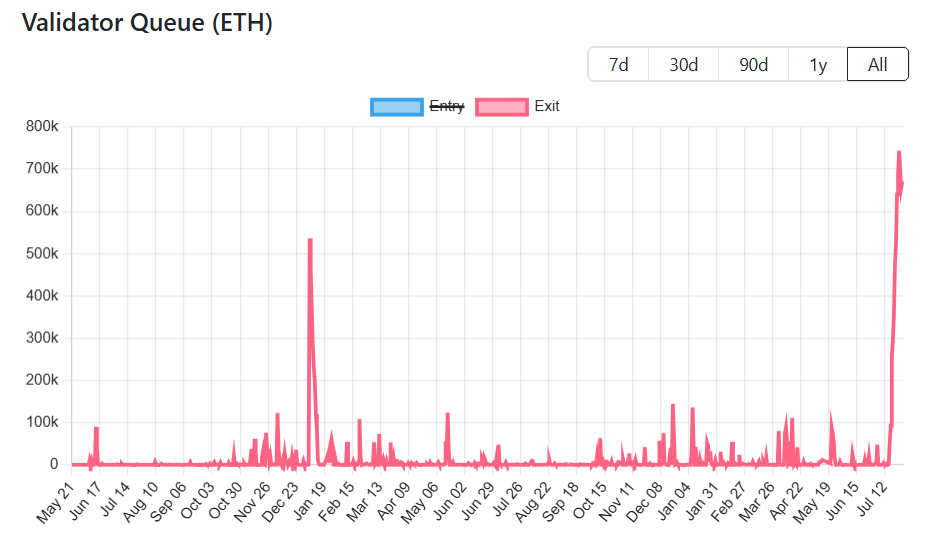 Перший попереджувальний сигнал полягає в тому, що понад 700 000 ETH наразі знаходяться у черзі на відстейкінг, що є найвищим рівнем за чотири роки, згідно з даними ValidatorQueue.