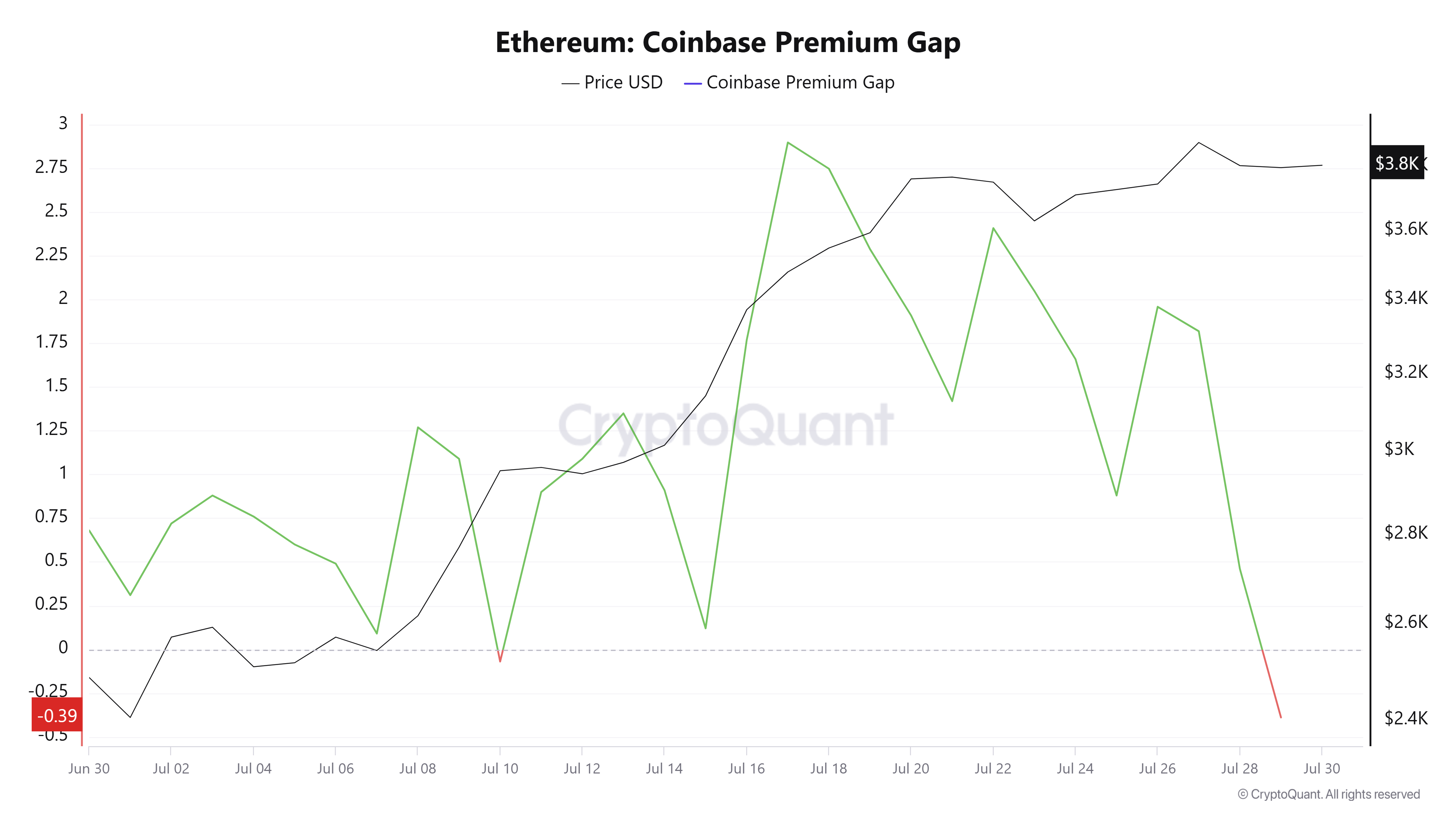 Згідно з даними CryptoQuant, другий попереджувальний сигнал полягає в тому, що ETH Coinbase Premium Gap став негативним наприкінці липня.