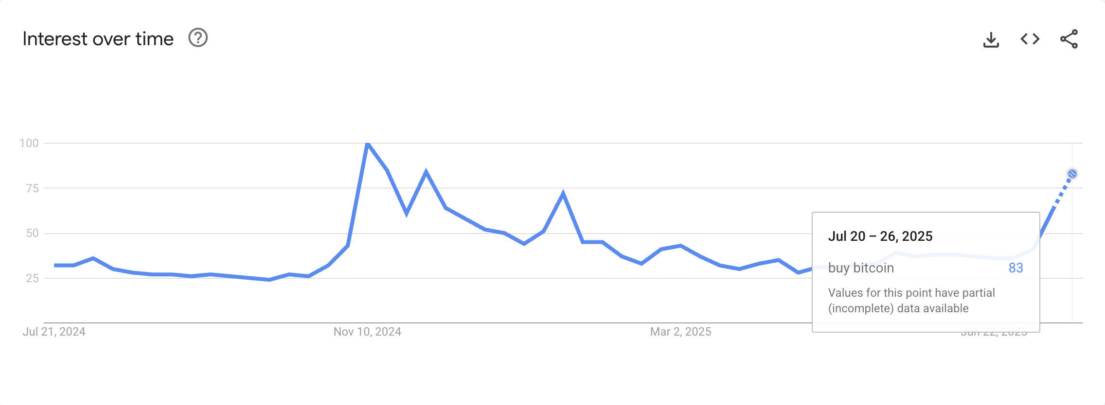 Цей сплеск збігається з різким зростанням пошуків у Google Trends за запитом “Купити біткоїн”, що свідчить про відновлення роздрібного інтересу поряд з інституційним імпульсом.