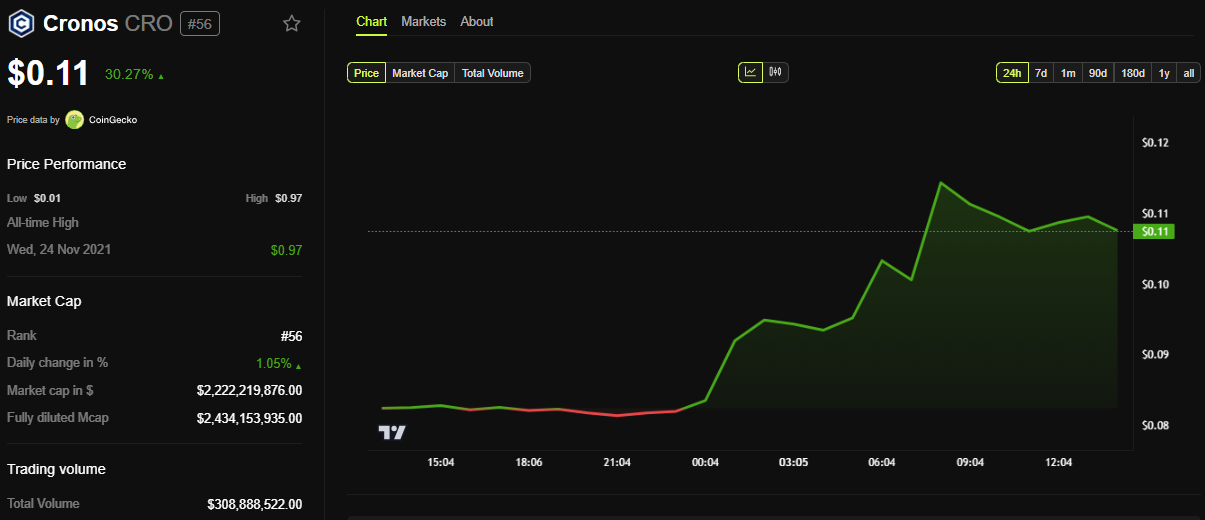 Попри суперечку, ціна Cronos (CRO) зросла на понад 30% за останні 24 години. На момент написання вона торгувалася за 0,11 доларів.