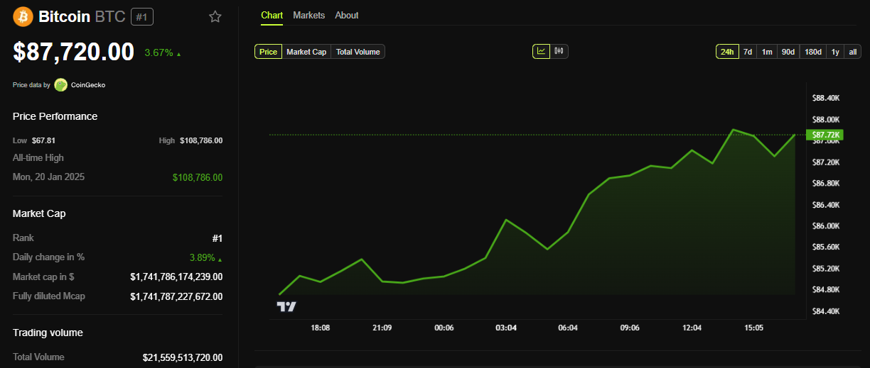 Тим часом дані BeInCrypto показують, що на момент публікації BTC торгувався за 87 720 доларів. Це зростання майже на 4% за останні 24 години, причому перша криптовалюта поступово наближається до психологічної позначки в 90 000 доларів.