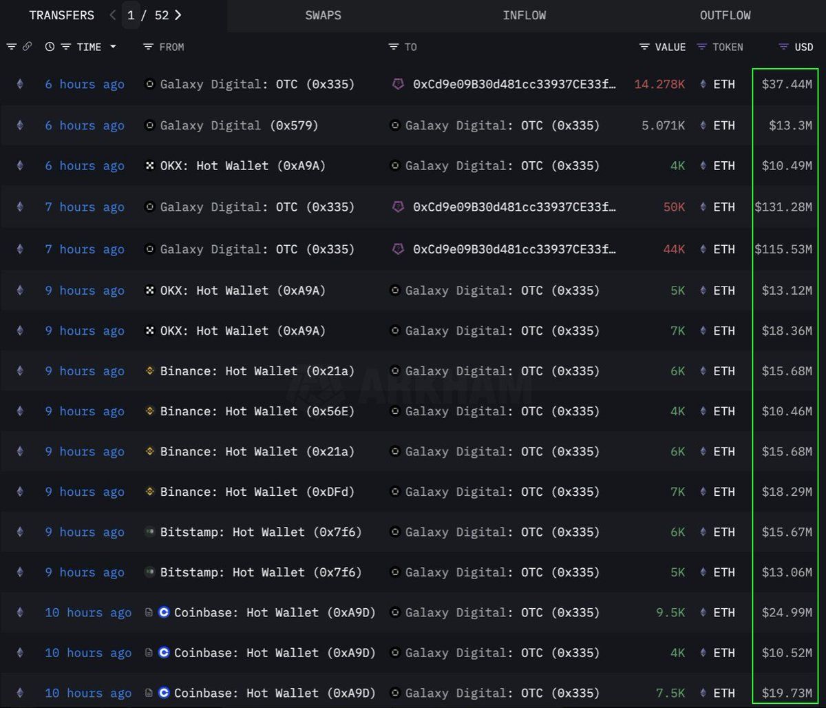 За даними Lookonchain, інституція або кит здійснили великомасштабну покупку 108 278 Ethereum (ETH), що еквівалентно 283 млн доларів, через OTC (позабіржовий) канал. Гаманець Galaxy Digital OTC виконав цю транзакцію. Цей гаманець вивів 89 000 ETH (вартістю 233,5 млн доларів) з бірж за попередні 12 годин перед тим, як перевести 108 278 ETH на гаманець з адресою 0x0b26.