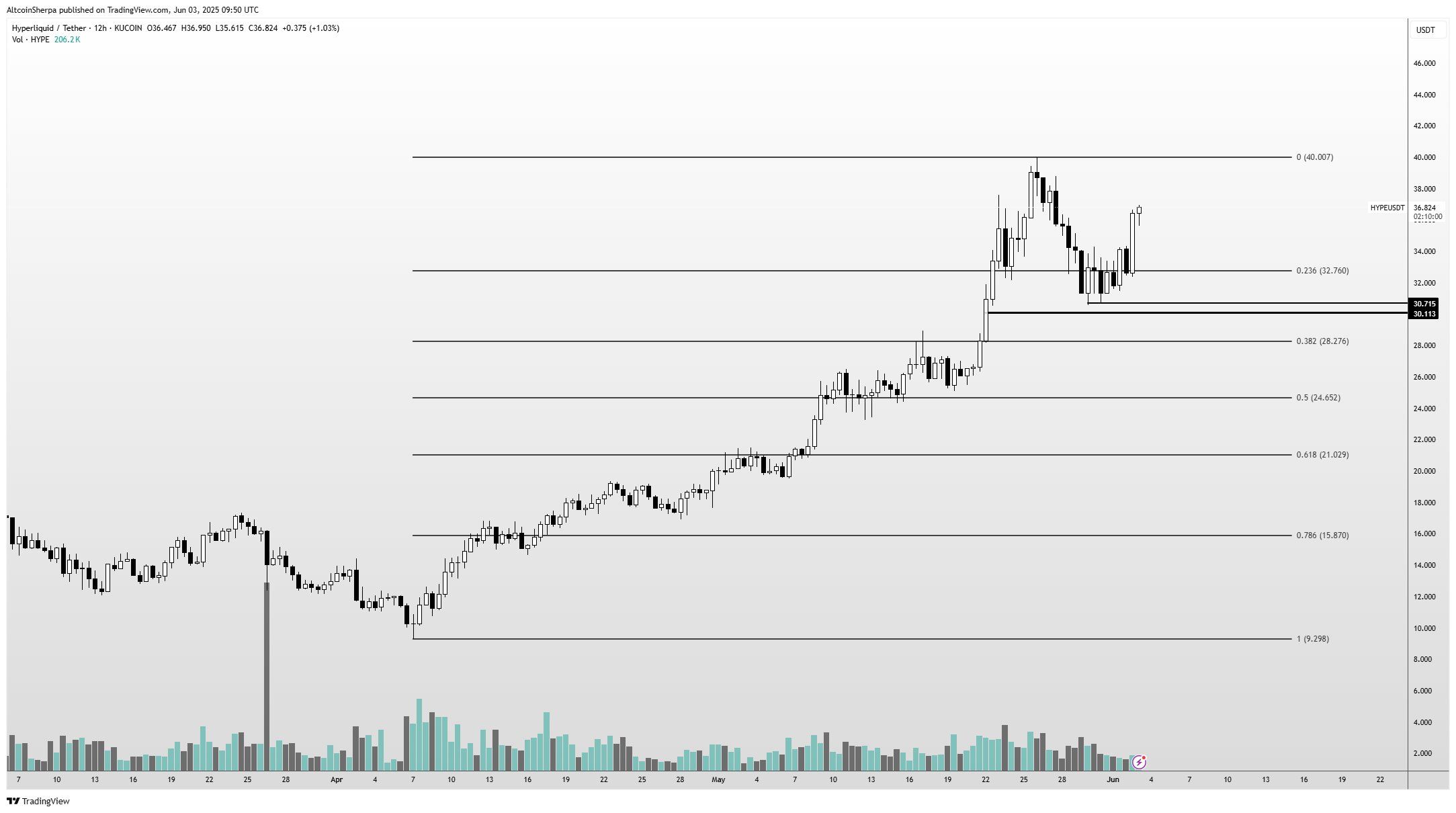 На момент написання, HYPE торгується за 36,59 доларів, що на 1,7 % менше за останні 24 години.