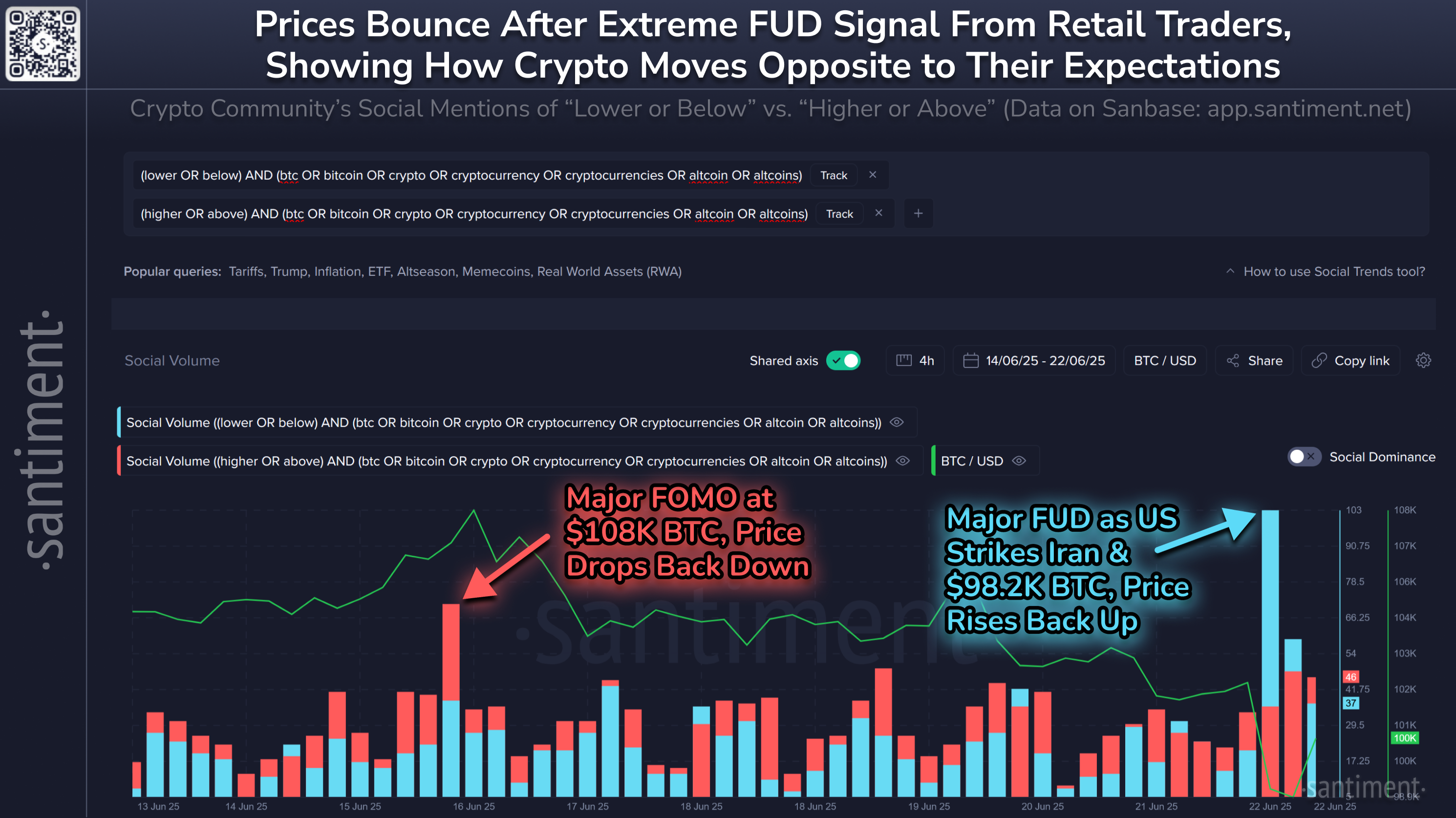 Однак аналіз Santiment свідчить, що біткоїн часто рухається проти настроїв роздрібних інвесторів. Дані соціального обсягу вказують на те, що надмірно позитивні обговорення останнім часом збігалися з падінням цін. Тим часом, під час періодів надзвичайно негативних обговорень — таких як нещодавній конфлікт США-Іран — ціна біткоїна, як правило, відновлювалася.