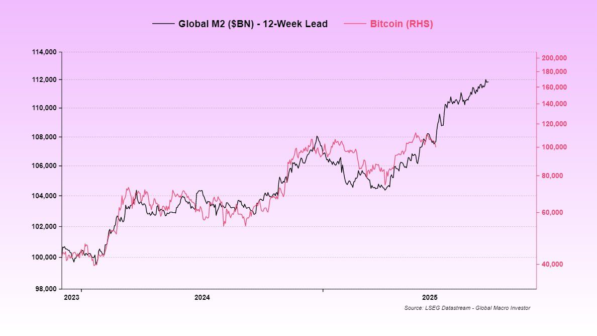 Рауль Пал, засновник і генеральний директор RealVision, поділився своєю точкою зору разом із графіком, що порівнює глобальну грошову масу M2 з ціною біткоїна. Він стверджував, що падіння біткоїна нижче 100 000 доларів не є несподіванкою, враховуючи його сильну кореляцію з ростом глобальної грошової маси M2.