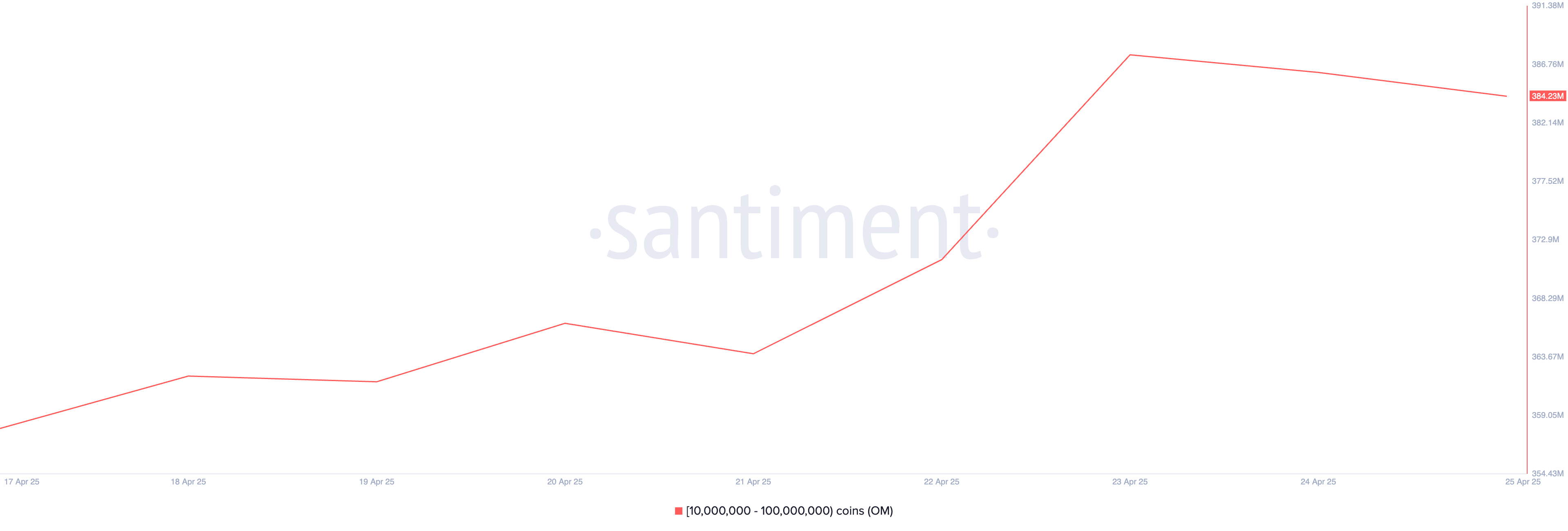 Нещодавнє падіння ціни OM відкрило можливості для стратегічного накопичення деякими з його найбільших власників. За даними ончейн-аналітики Santiment, адреси китів, які володіють від 10 мільйонів до 100 мільйонів токенів OM, придбали 26 мільйонів OM протягом тижня, що розглядається.