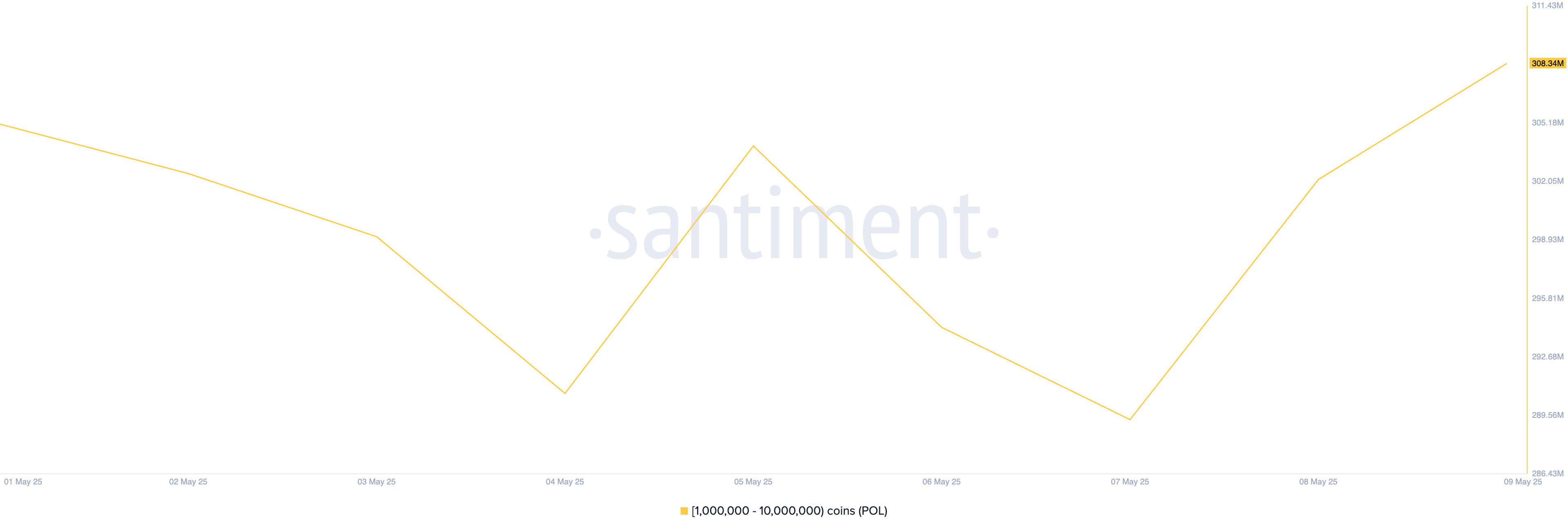 Раніше відомий як MATIC, POL — ще один токен, на який звернули увагу кити цього тижня. За даними Santiment, адреси гаманців, які утримують від 1 мільйона до 10 мільйонів токенів, придбали 3,24 мільйона POL за останні сім днів.