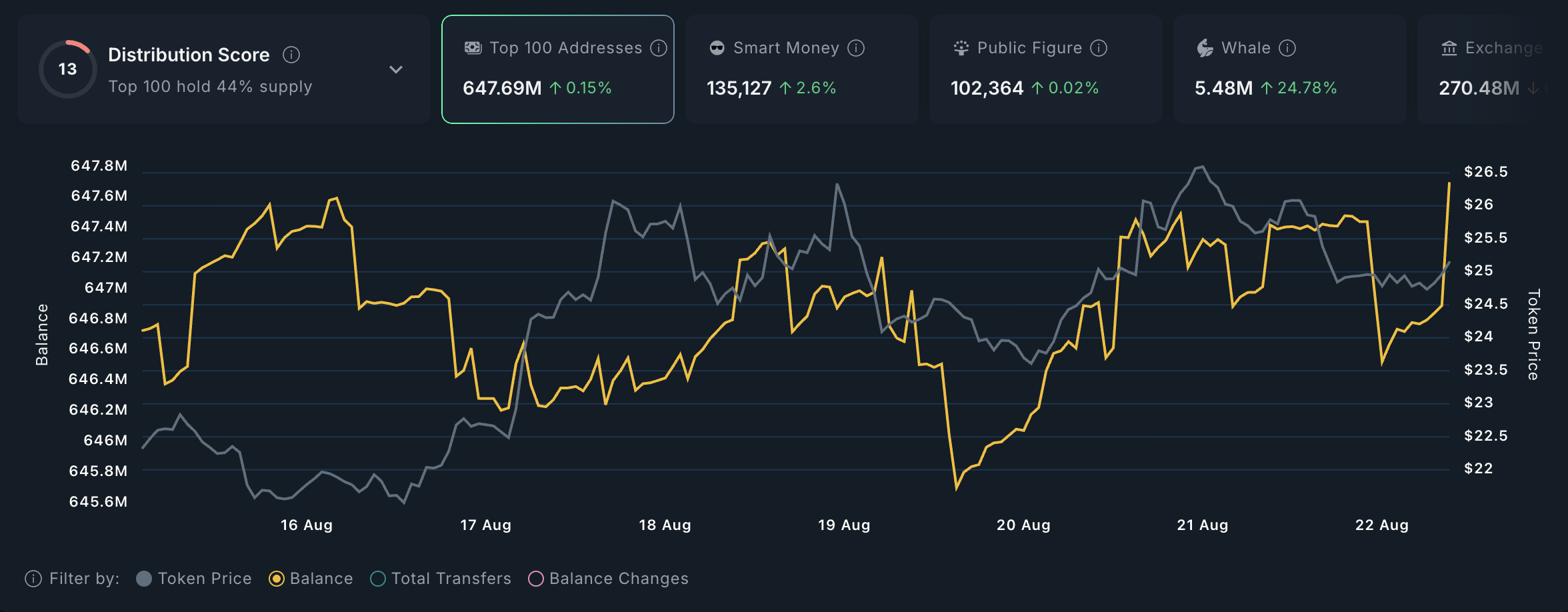 Однак, незважаючи на загальне зниження, ончейн-дані свідчать про те, що криптокити активно накопичують окремі альткоїни. Цей аналіз розглядає деякі з них.