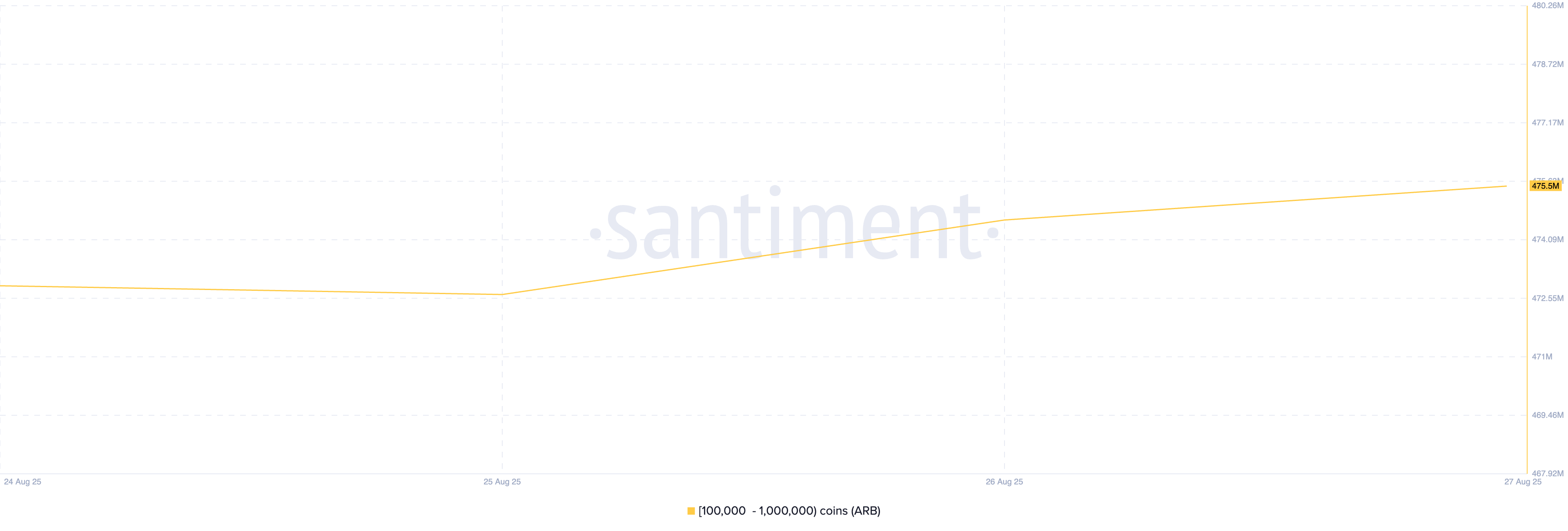 Токен рівня 2 (L2) ARB є одним із активів, на які криптокити очікують прибутку у вересні. Дані в ланцюжку показують, що з 24 серпня великі власники з гаманцями, що містять від 100 000 до 1 мільйона ARB, накопичили 2,1 мільйона токенів.