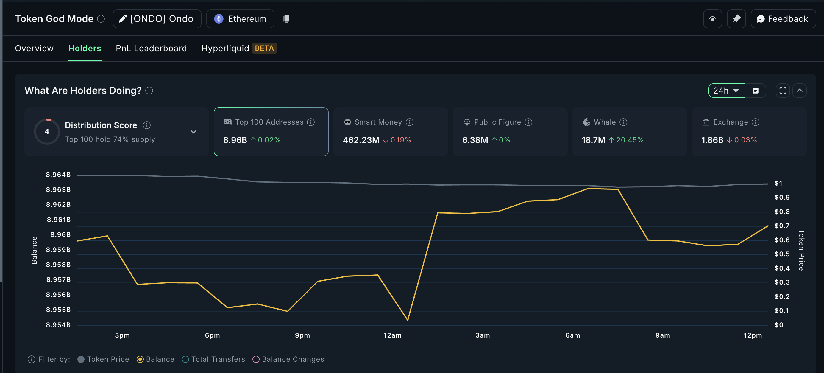 За останні 24 години ONDO зафіксував зростання на +20,45% у володіннях криптокитів, тоді як баланси на біржах знизилися лише на -0,03%. Це тонкий, але показовий знак: криптокити купують, тоді як роздрібні інвестори, здається, продають на тлі недавнього падіння ціни на 4% за останні 7 днів.
