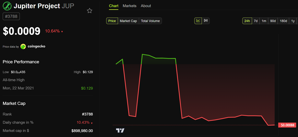Незважаючи на ажіотаж навколо Jupiter Studio, ціна JUP знизилася на понад 10 % і торгувалася за 0,0009 доларів на момент написання.