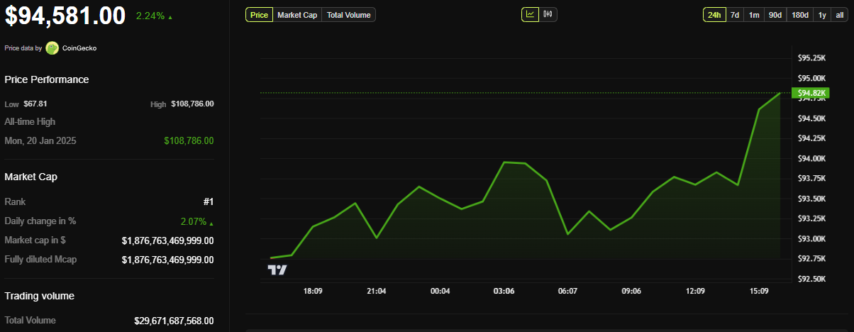 Важливо зазначити, що біткоїн торгувався значно вище своєї максимальної болі або страйкової ціни у 86 000 доларів. Зазвичай, коли опціони наближаються до закінчення, ціна активу має тенденцію тяжіти до рівня максимальної болі. Хоча біткоїн торгувався за 93 471 доларів за кілька хвилин до закінчення опціонів, зараз він продається за 94 581 доларів.