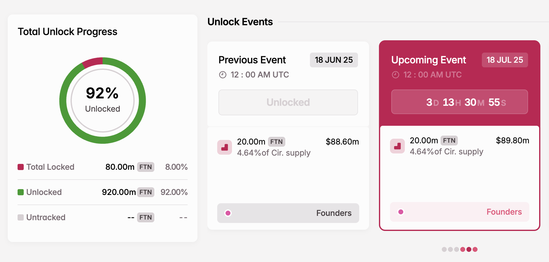 - Кількість токенів для розблокування: 20 мільйонів FTN (2% від загальної пропозиції)