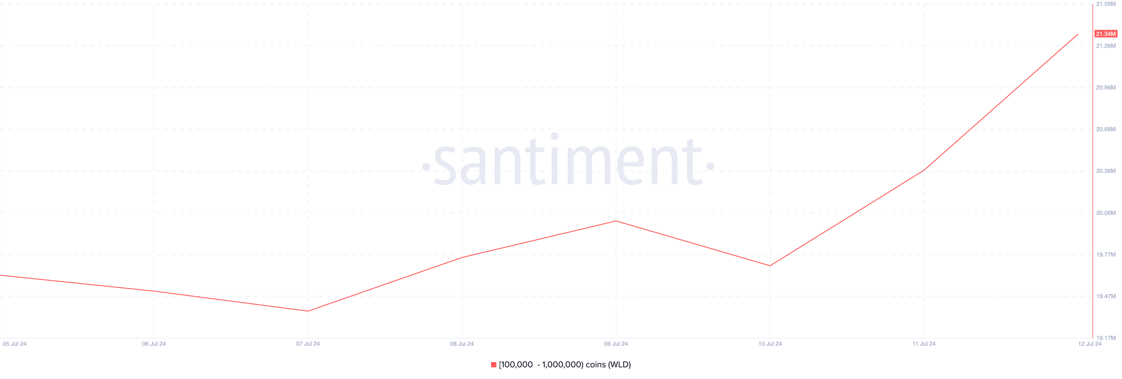 WLD, токен, що забезпечує роботу Worldcoin Сема Альтмана, є ще одним альткоїном, який цього тижня купували криптокити. Дані з Santiment показують помітне зростання кількості токенів у гаманцях китів, які володіють від 100 000 до 1 мільйона WLD.