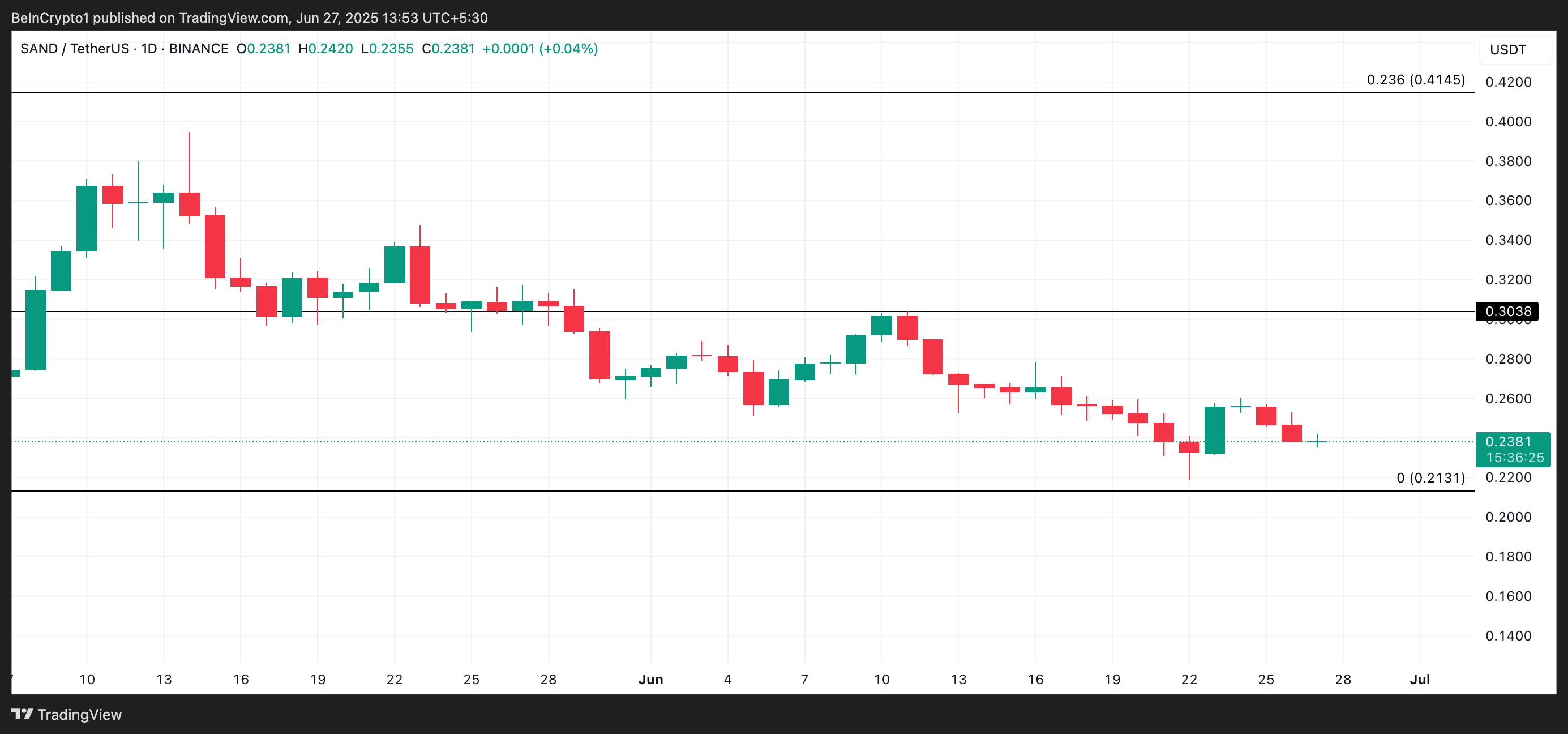 З іншого боку, якщо активність купівлі знизиться, вартість SAND може впасти до 0,21 доларів.