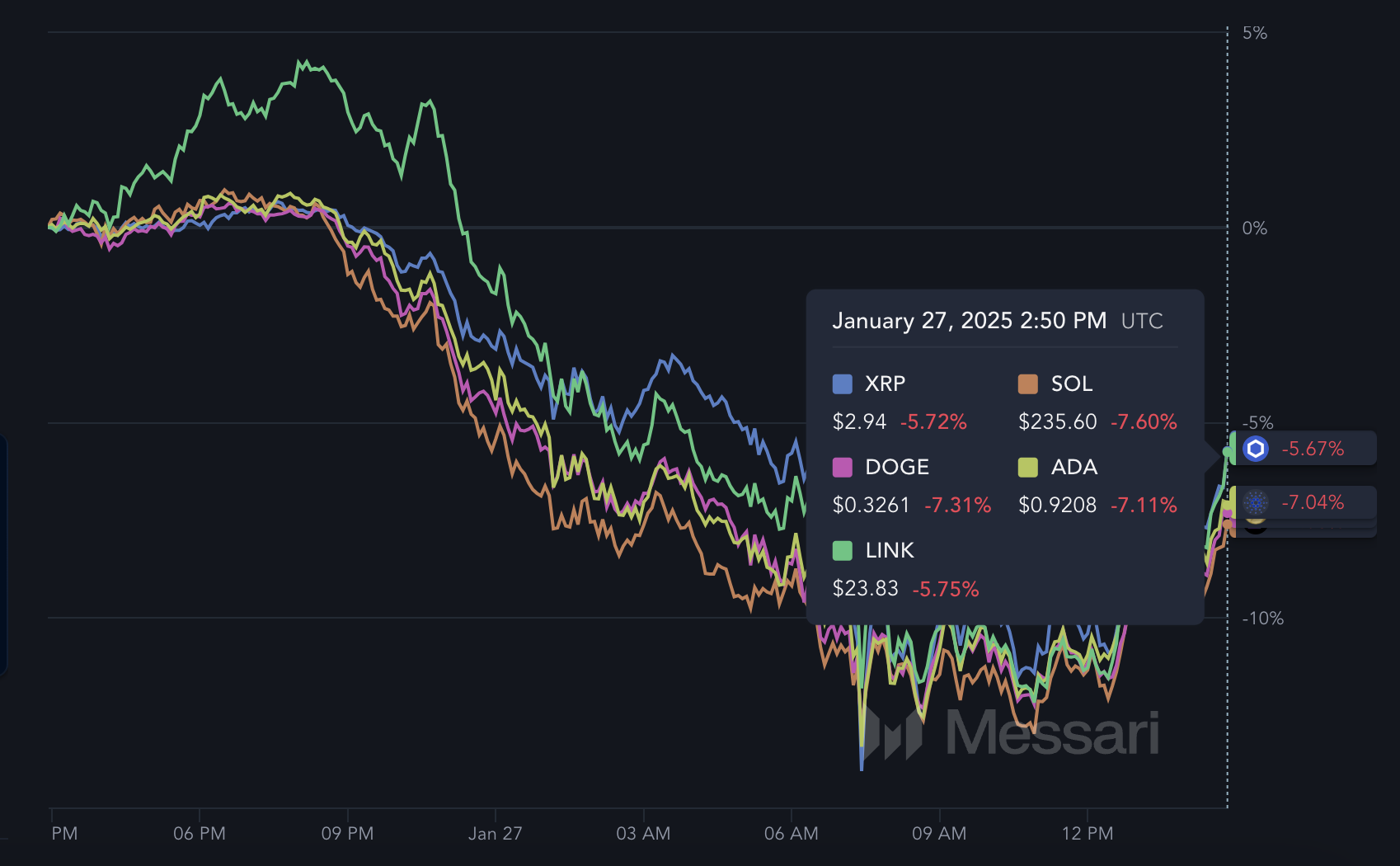 Провідні приклади включають SOL, XRP, DOGE, ADA та LINK, усі з яких зазнали зниження за останні 24 години. SOL, DOGE та ADA впали більш ніж на 7%, тоді як LINK та XRP знизилися більш ніж на 5%. Позитивні новини про криптополітику від адміністрації Трампа цього тижня можуть викликати зростання для деяких з цих активів.