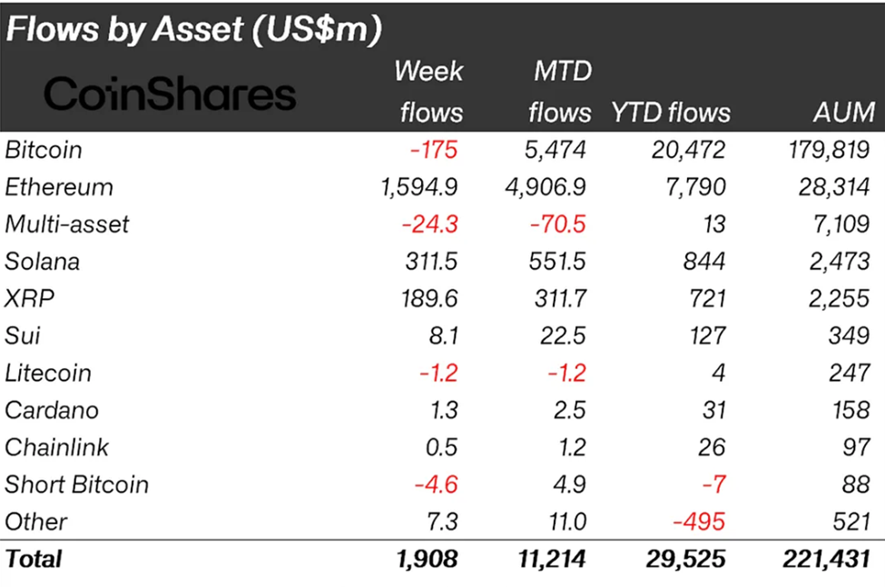 Останній звіт CoinShares свідчить, що криптовалютні надходження досягли 1,908 млрд доларів минулого тижня, що є значним зростанням порівняно з тижнем, що закінчився 19 липня, коли було зафіксовано 1,049 млрд доларів.