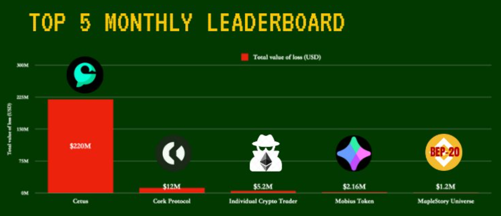 Найбільша експлуатація стосувалася Cetus Protocol, децентралізованої біржі, що працює на блокчейні Sui, яка втратила приблизно 223 млн доларів в одній атаці.
