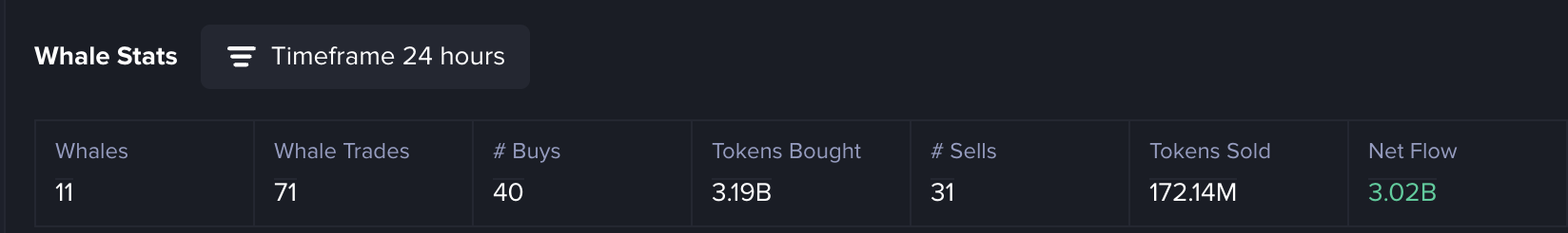 Згідно з даними Moby Screener, 11 китів здійснили 70 великих угод протягом останніх 24 годин. З них 39 є купівельними транзакціями, що становлять 3,17 мільярда BONK токенів, у порівнянні з 31 продажем, що становить лише 172,14 мільйона токенів.