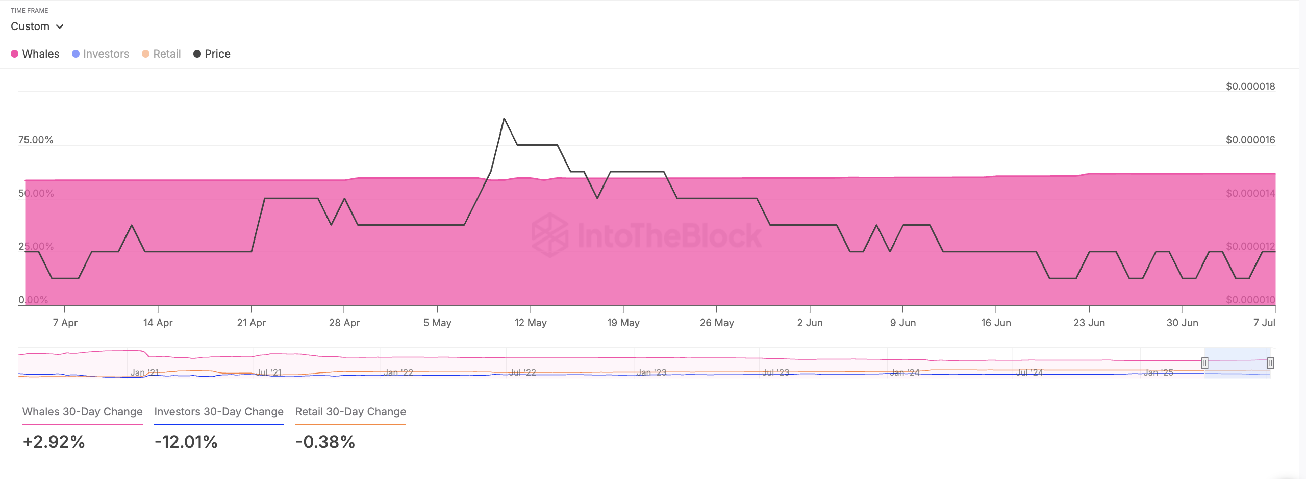 Згідно з IntoTheBlock, історична концентрація SHIB показує збільшення на 3 % у володіннях адресами, які мають більше 1 % від загальної обігової пропозиції токена. Це означає, що найбільші власники посилюють контроль над мемкоїном, що є ознакою зростаючої впевненості серед великих інвесторів.