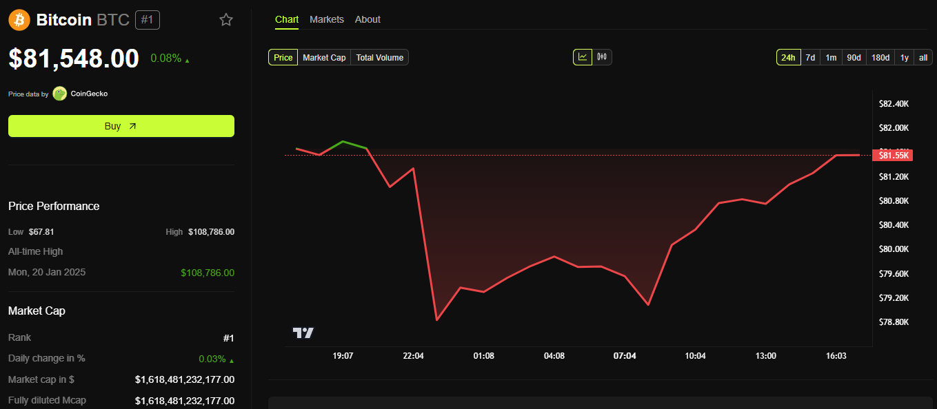 SponsoredРинкова капіталізація криптовалют залишається на рівні приблизно 2,5 трильйона доларів. Ціна біткоїна тримається вище 81 000 доларів після відновлення на 10 % від 9 квітня, коли Трамп оголосив про 90-денну паузу в тарифах, за винятком тарифів на Китай.