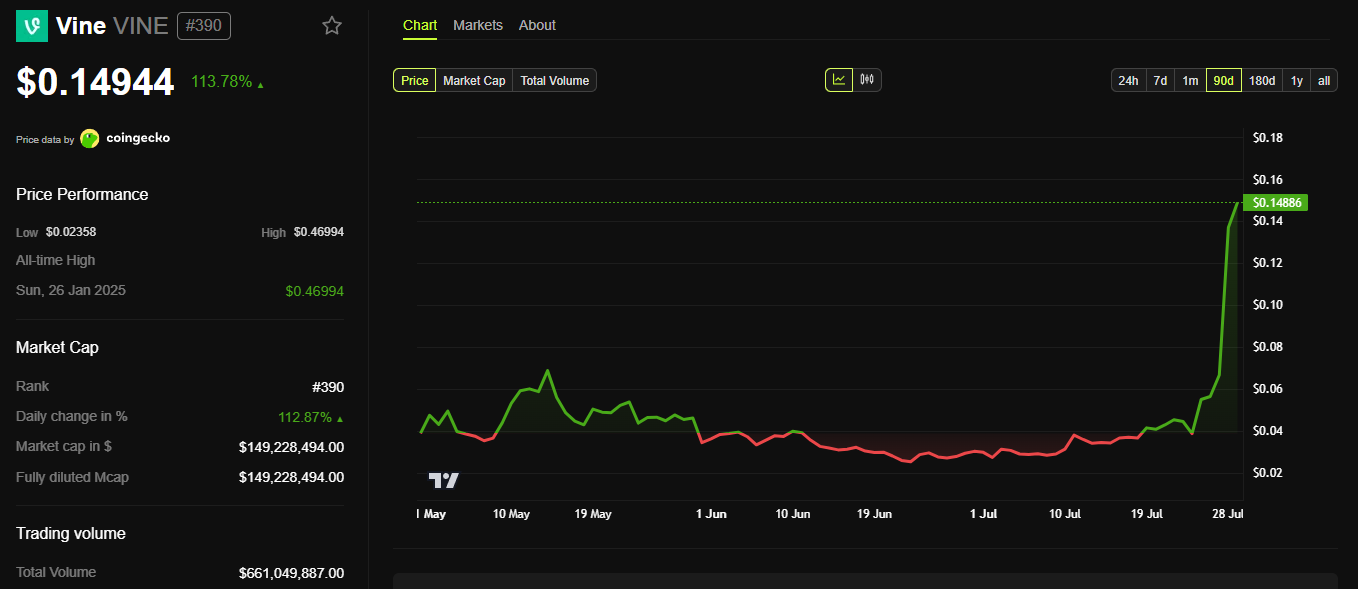 На момент публікації VINE торгується приблизно за 0,15 доларів з ринковою капіталізацією близько 150 млн доларів, за даними BeInCrypto. Його ціна зросла більш ніж на 400 % з початку липня і поки що не демонструє чітких ознак корекції.