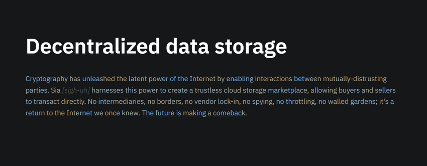 Проєкт Sia створено у 2013 році Девідом Воріком і Луком Шампіном. Він складався з двох організацій: неприбуткової Sia Foundation, зосередженої на блокчейні Sia та екосистемі, і комерційної Skynet Labs, децентралізованої хмарної платформи. Хоча команда засновників переключила увагу з даних на вебдодатки, Sia залишається ключовим компонентом екосистеми Skynet.