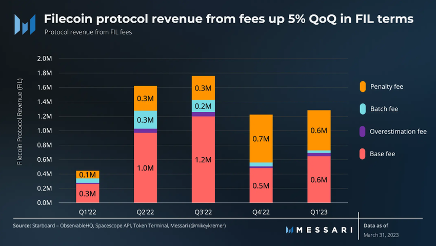 Цей протокол Filecoin використовує гнучкі комісії. Згідно з аналізом доходів Messari, доходи Filecoin складаються з чотирьох компонентів: