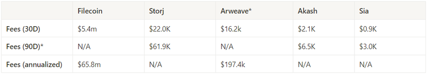Оскільки низькі витрати є однією з переваг децентралізованого зберігання порівняно з централізованими рішеннями, як-от Amazon Web Services, комісії за зберігання зазвичай становлять меншу частину доходу протоколу, ніж транзакційні. Наприклад, Filecoin стягує приблизно 0,2 доларів на місяць за терабайт простору.