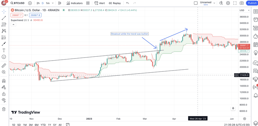 Якщо ви добре розбираєтеся в патернах торгівлі криптовалютами, таких як прапор і жердина, трикутники та інші, ви можете ефективно використовувати індикатор Supertrend. Щоб відкрити довгу позицію, перевірте, чи відбувається прорив патерну, коли лінія Supertrend змінюється з червоної на зелену.