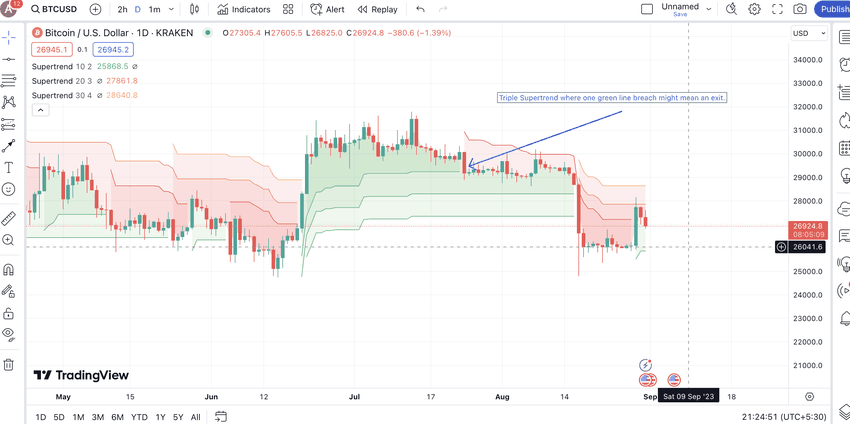 Ідея проста. Якщо лінія Supertrend переходить з зеленого на червоний, це пропонує сильний сигнал на продаж. Цей рух вказує на короткострокову або довгострокову зміну тренду з бичачого на ведмежий. Трейдери, які вже утримують позиції, можуть вийти, коли ціна прориває зелену лінію і починає з’являтися червона.