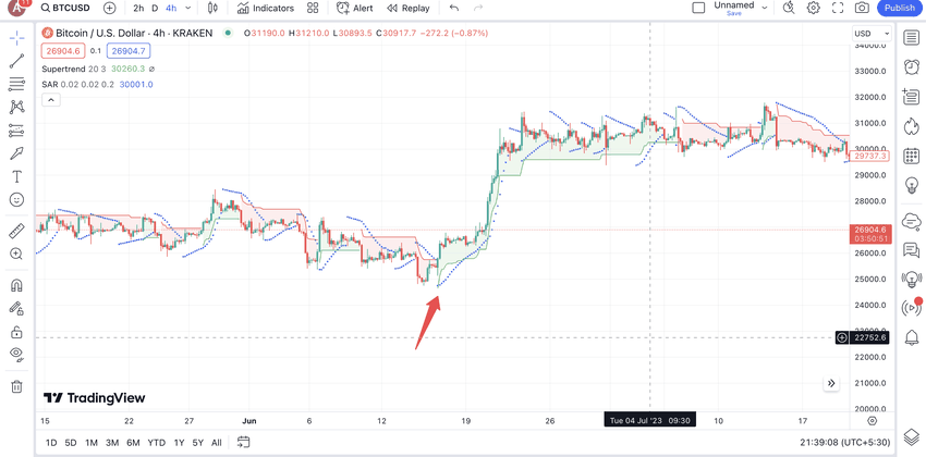 Індикатор Parabolic SAR складається з точок, де бичачий набір точок розташований під ціновою дією для бичачого тренду. Поєднайте це із зеленою лінією Supertrend, і ви можете побачити гарну можливість для покупки. Щоб максимально використовувати індикатори Parabolic SAR та Supertrend для торгівлі криптовалютами, краще використовувати їх на графіках від 30 хвилин до 4 годин.