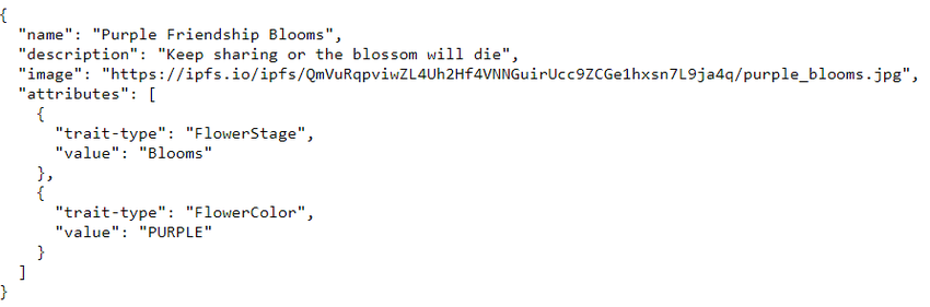 На зображенні вище ви можете побачити метадані для того, що виглядає як динамічний NFT фіолетової квітки. Він розташований на IPFS. На зображенні нижче ви можете побачити фактичне відображення цих метаданих, яке, насправді, є фіолетовою квіткою.