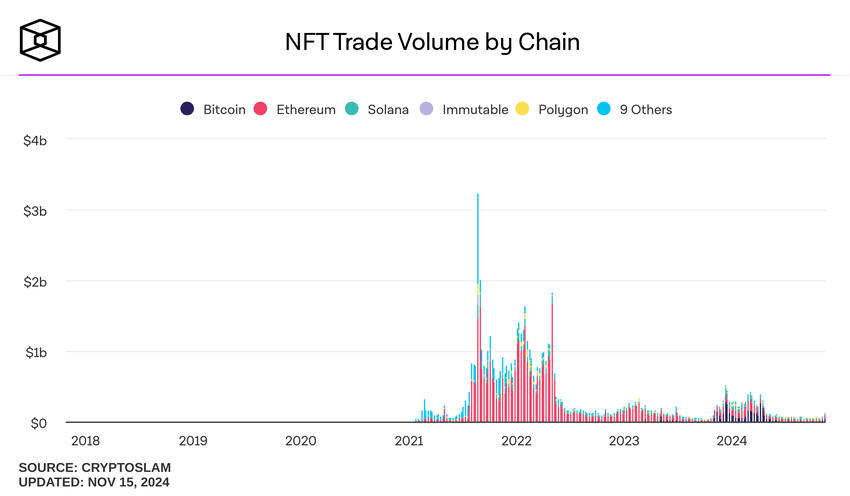 Торгівля NFT досягла піку наприкінці 2021 року до середини 2022 року. Це сталося через низку каскадних причин, але ми можемо підсумувати це як спекуляцію.