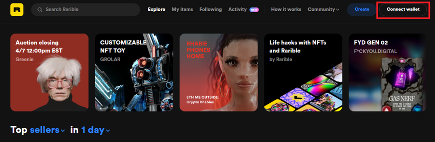 На якому б із них ви не побували, ви зможете легко підключити ваш гаманець MetaMask до кожного сайту без необхідності створювати нові облікові записи. Наприклад, якщо ви відвідаєте Rarible, який винагороджує вас токенами RARI, коли ви продаєте та купуєте NFT, у верхньому правому куті ви побачите «Підключити гаманець».