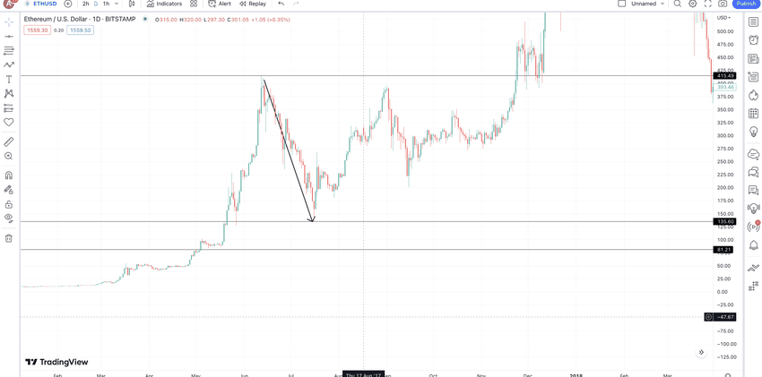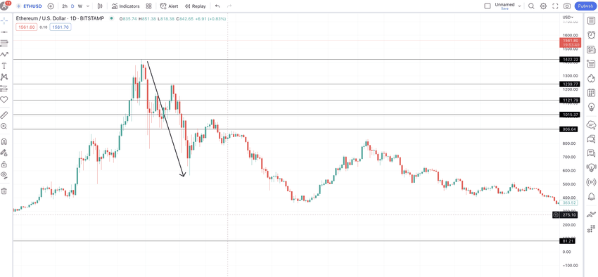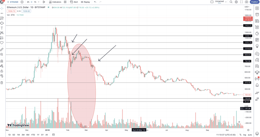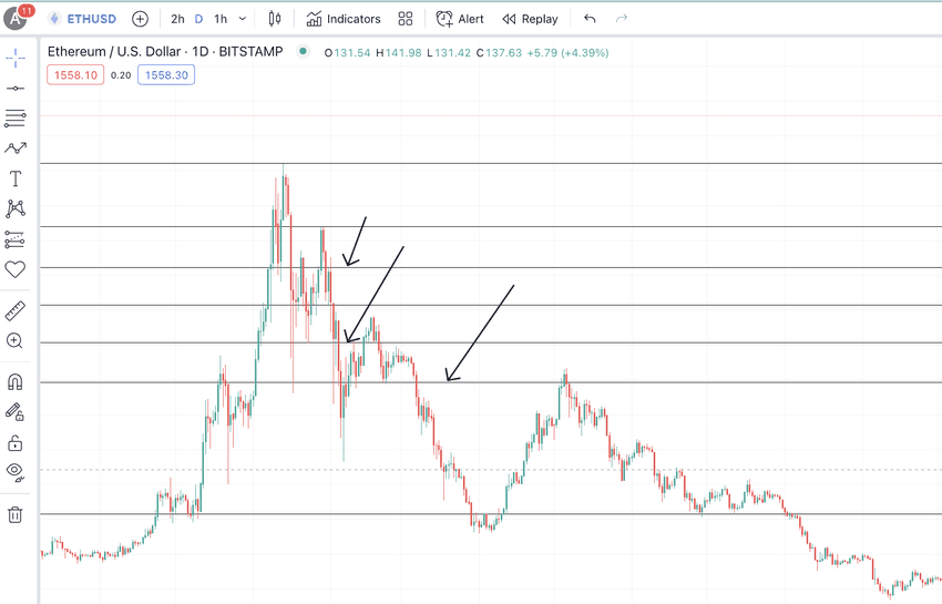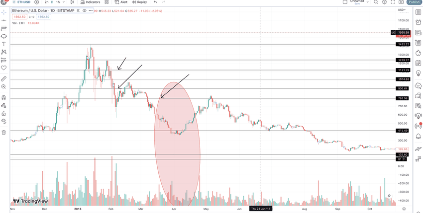 Повернемося до графіка ETH, що відповідає початку 2018 року, коли ціни впали з 1400 доларів до майже 400 доларів за кілька місяців. Зверніть увагу, як було кілька рівнів підтримки, які ETH пробив на шляху до 400 доларів. Ці рівні згодом стали зонами опору, коли ETH почав знову зростати з 2020 року.