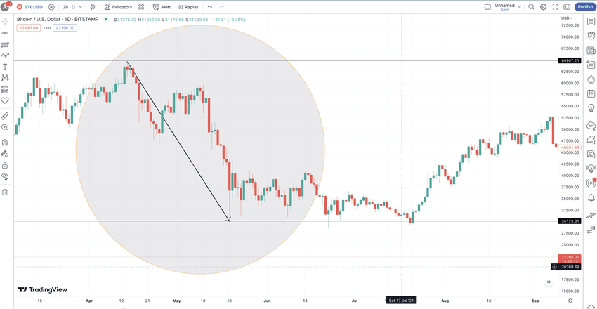 Падаючий ніж спостерігався у березні 2020 року, коли масові розпродажі з’явилися в різних класах активів через пандемію Covid-19. Біткоїн також не був винятком, оскільки ціни скоригувалися майже на 60% менш ніж за десять днів.